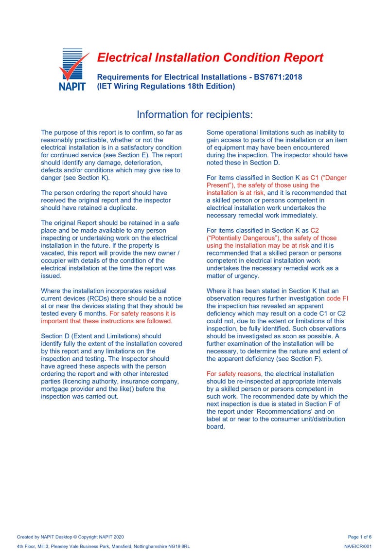 Code 1: (“Danger Present”), the safety of those using the installation is at risk and it is recommended that a skilled person or persons competent in electrical installation work undertakes the necessary remedial work immediately.